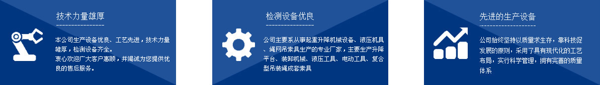 泰州市如意機(jī)械設(shè)備有限公司,座落在中國(guó)海軍誕生地江蘇泰州市,緊連328國(guó)道,東有鐵路相連,同時(shí)有滬寧、寧通高速公路相交,地理位置十分優(yōu)越,自然環(huán)境得天獨(dú)厚。   本公司系從事起重升降機(jī)械設(shè)備、液壓機(jī)具、繩網(wǎng)吊索具生產(chǎn)的專(zhuān)業(yè)廠(chǎng)家,主要生產(chǎn)千斤頂、液壓拉馬、軸承加熱器、升降平臺(tái)、裝卸機(jī)械、液壓工具、電動(dòng)工具、復(fù)合型吊裝繩成套索具、高強(qiáng)纖維柔性吊裝帶、起重鏈條成套索具、橫梁吊具、注塑繩、軟梯、安全帶、安全網(wǎng)等幾大系列、上百種規(guī)格的產(chǎn)品,廣泛應(yīng)用于電力、油田、大型鋼廠(chǎng)、機(jī)電、化工、航空、冶金、機(jī)械、鐵道、造紙、港口、建筑等領(lǐng)域。   本公司生產(chǎn)設(shè)備優(yōu)良、工藝先進(jìn),技術(shù)力量雄厚,檢測(cè)設(shè)備齊全,其中升降平臺(tái)、千斤頂、吊具、加力扳手、液壓矩扳手經(jīng)泰州質(zhì)量技術(shù)監(jiān)督局監(jiān)督檢驗(yàn) ...[點(diǎn)擊詳情]